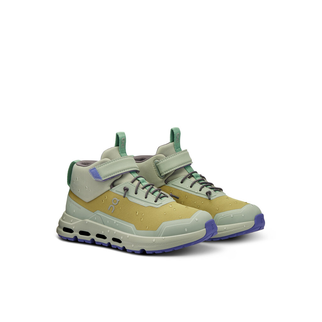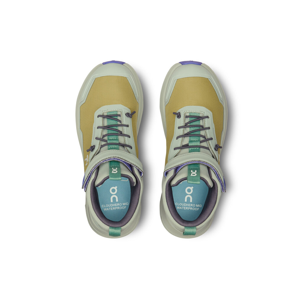 A waterproof mid-top hiking boot for our little explorers. A lightweight, cushioned and responsive kids' hiking boot with Helion™ super foam in the midsole that supports their every step and CloudTec® technology that kicks in even at lower weights. The On Cloudhero Mid Waterproof kids' hiking boot has an extra "sticky" outsole made from the same Missiongrip™ rubber used in our adult boots, improving traction on slippery terrain and preventing slippage. As a bonus, the kids' hiking boots have a self-lacing system. Dirt, mud and puddles are pretty irresistible to little explorers. And that's where the Cloudhero Mid Waterproof ankle boot is great. With a 100% recycled waterproof membrane, this durable little hiking boot will keep your feet fresh and dry. These amazing waterproof trekking boots are suitable for children aged 4-8.