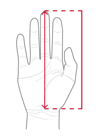 - Změřte vzdálenost od špičky prostředníčku po spodní část dlaně (viz obrázek).