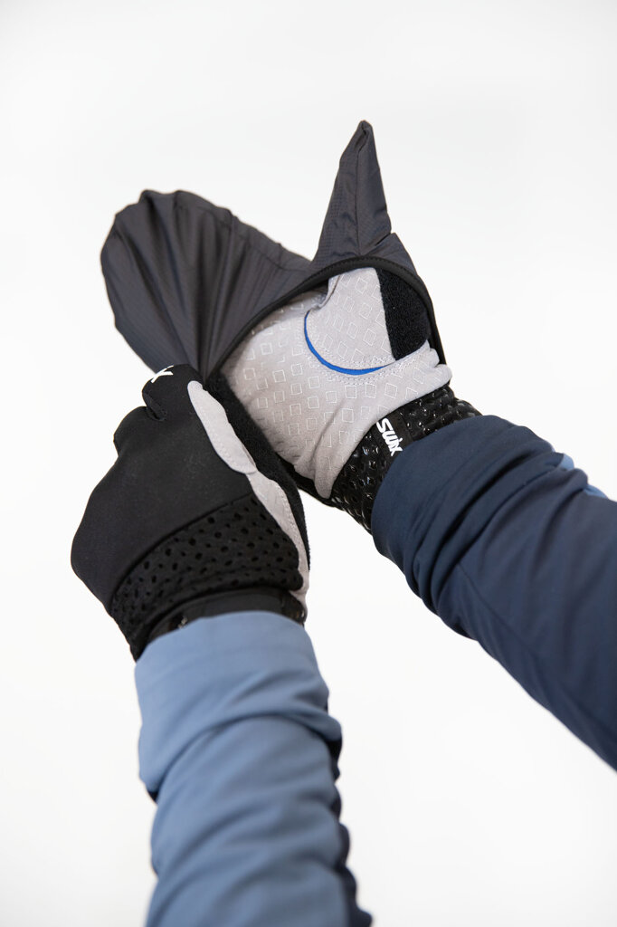 This premium cross-country skiing glove is designed for performance, featuring a stowable wind-resistant mitten cover for added protection in harsh conditions.