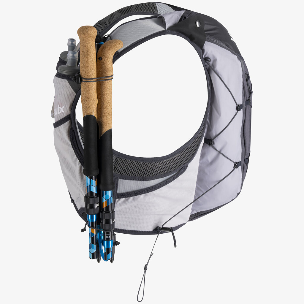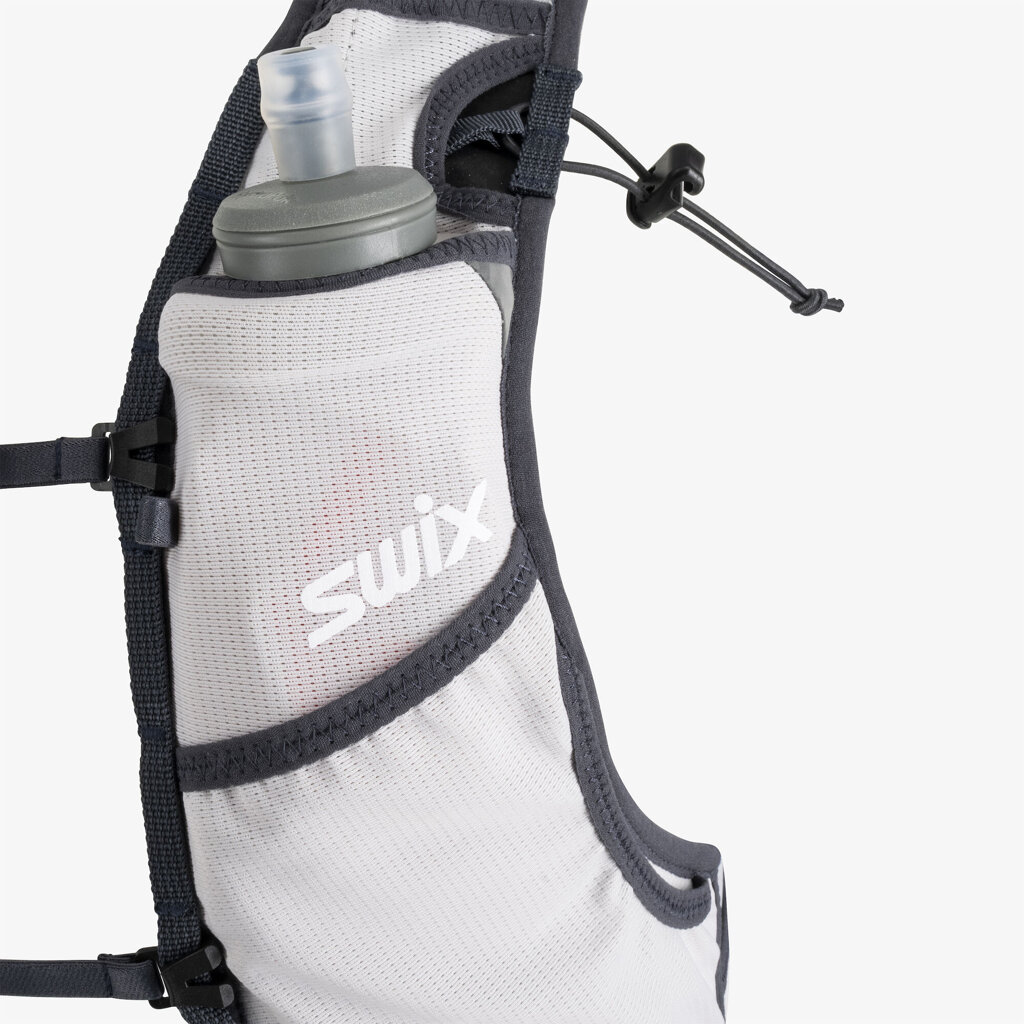 Swix Pace 4L Hydration Vest is designed for longer trail runs and endurance sessions. It features a 4-liter storage capacity and includes a hydration reservoir and two 500 ml soft flasks. Constructed with 20D recycled nylon and a polyester space mesh contact surface for comfort and airflow. The external pockets are made from polyester/elastane mesh for stretch and accessibility. Multiple front pockets keep fuel and essentials within easy reach, ensuring optimal efficiency on the move.
