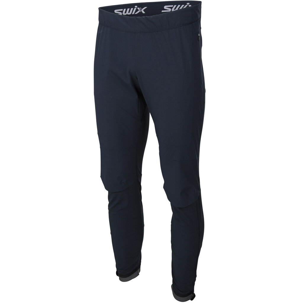 Infinity Pants are high-performance cross-country skiing pants designed for optimal comfort and mobility. The front thighs feature windproof fabric to protect against the elements, while the brushed elastic back panels provide warmth and freedom of movement. They include an elastic waistband with internal drawcord, zippered hand pockets, leg zippers for easy on/off, and open knee construction. Reflective details at the front and back enhance visibility in low-light conditions. Key Features: