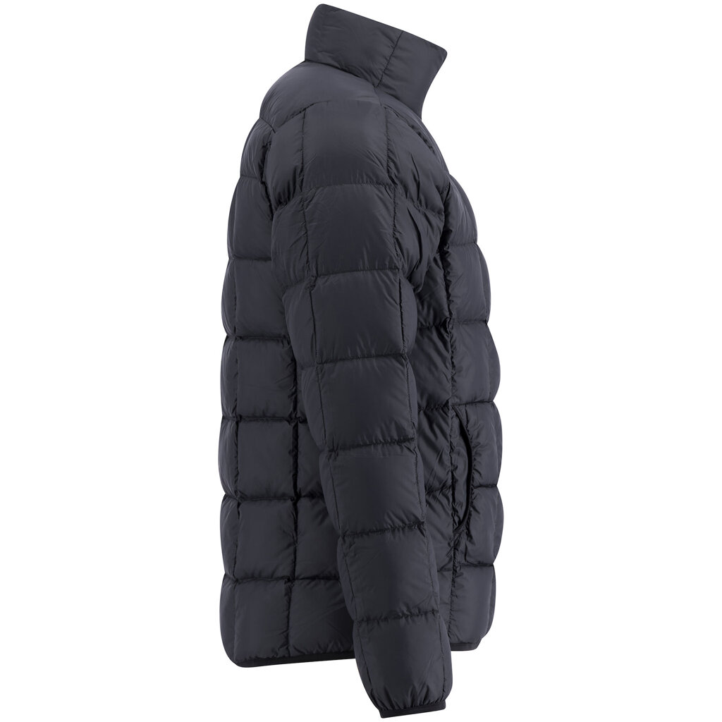 To avoid using new resources, the filling is made of recycled down, and the fabrics are crafted from recycled nylon. It features a practical chest pocket and two open hand pockets. Soft elastic bands at the hem and cuffs ensure heat retention.