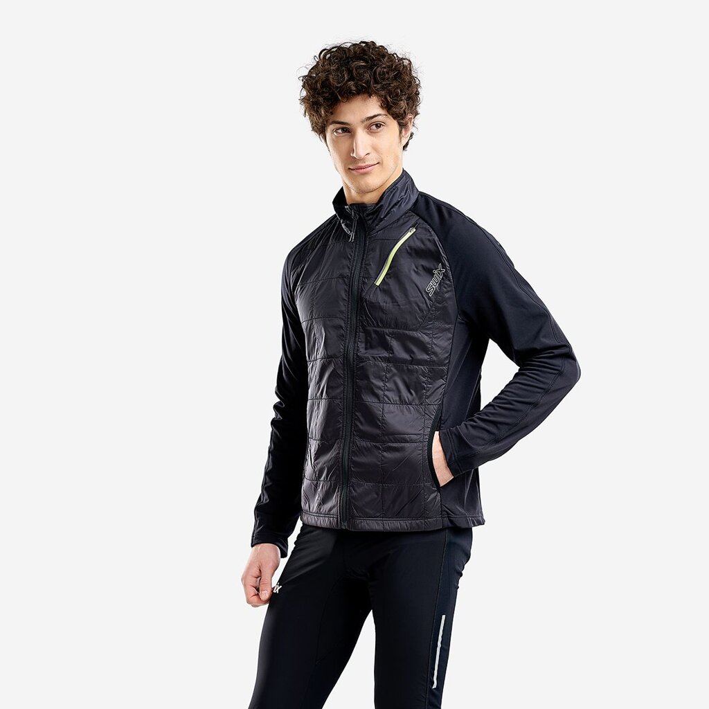 The SWIX Navado Push Men's Hybrid Jacket is a versatile, lightweight jacket or mid-layer, functioning as a perfect universal product for colder days during sport and leisure. It features a hybrid design with an insulated front panel equipped with a windproof membrane, offering core warmth and protection. The back panel utilizes a breathable stretch material to ensure excellent ventilation and unrestricted movement. This jacket expertly balances warmth, wind resistance, and breathability, making it ideal for cross-country skiing, running, or everyday cold-weather wear.