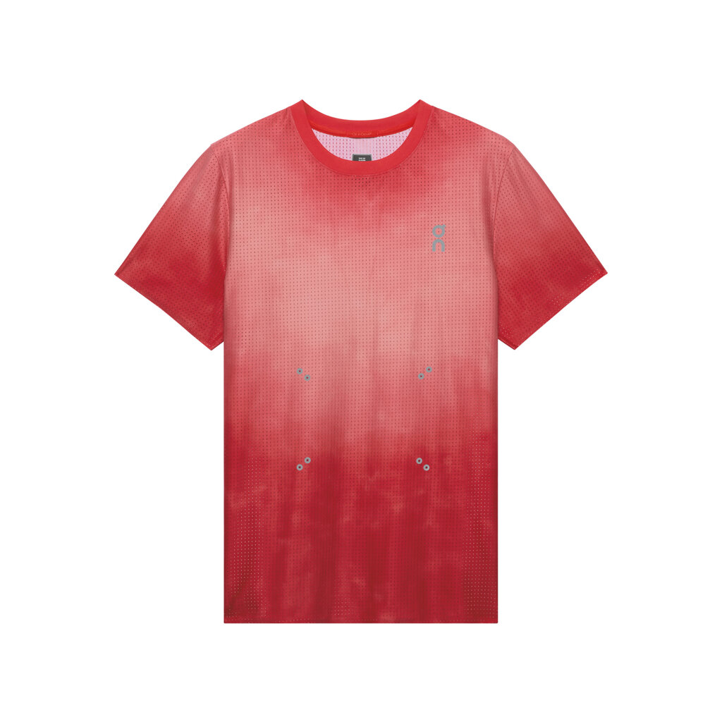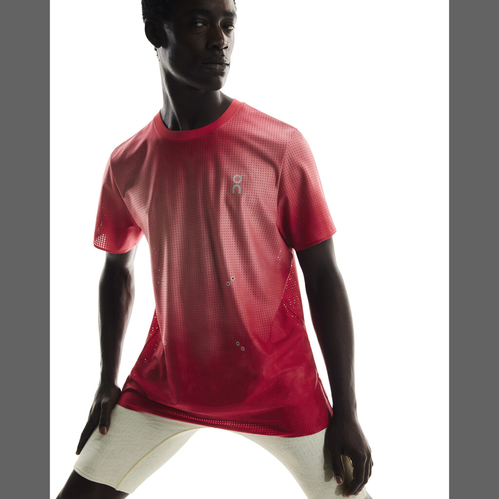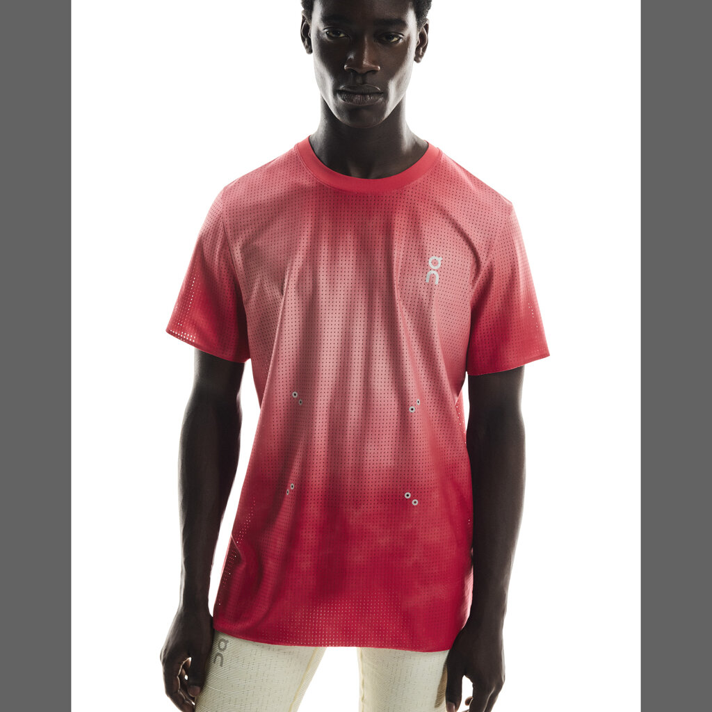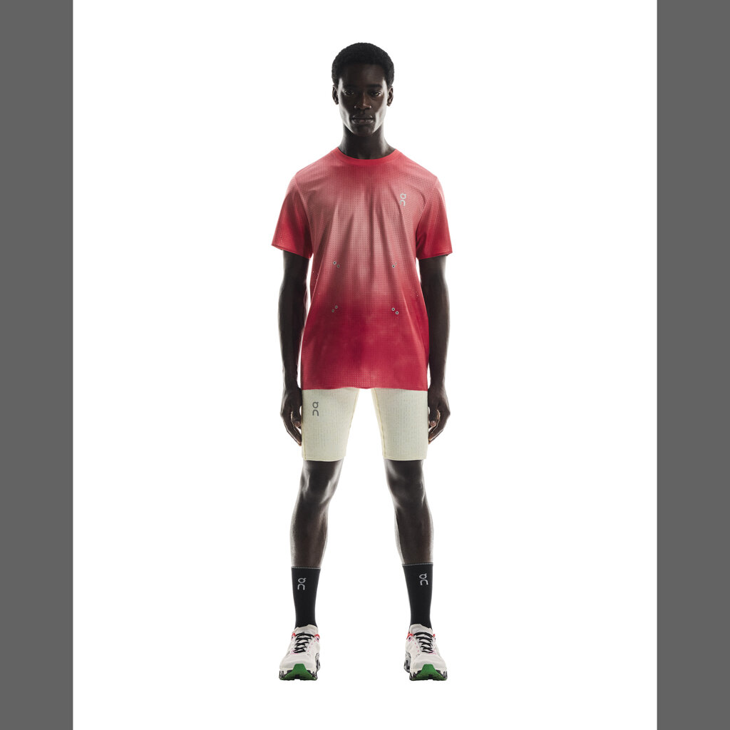 A running t-shirt created as a tribute to running culture. The functional t-shirt is lightweight, very stretchy and luxuriously soft. Its regular cut that never constricts stands out with glued edges on the sleeves, neck and bottom hem for added comfort. This sports t-shirt is made of CleanCloud® polyester, a material with 20% recycled carbon emissions. Running t-shirt with glued silver reflective logos and eyelets for attaching a race number, bold graphics and colors that lift the mood.