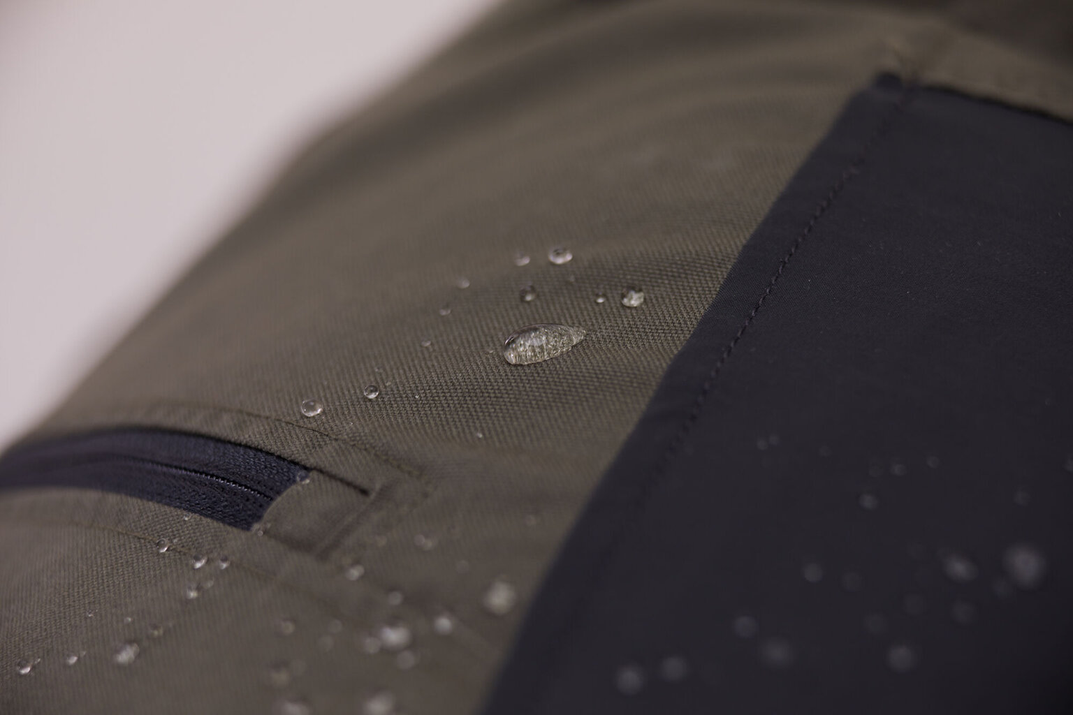 Makke Pro Pant is designed according to the hybrid principle – right material in the right places – for an optimal balance between weather protection and comfort. The main fabric is a sturdier version of Lundhags PolyCotton Wax (LPC), a blend of organic cotton and recycled polyester with a waxed surface that resists light rain. This is combined with a durable, insulating, and ventilating material. The waterproof 3-layer stretch provides freedom of movement while keeping you dry, and taped seams reduce the risk of water penetration.