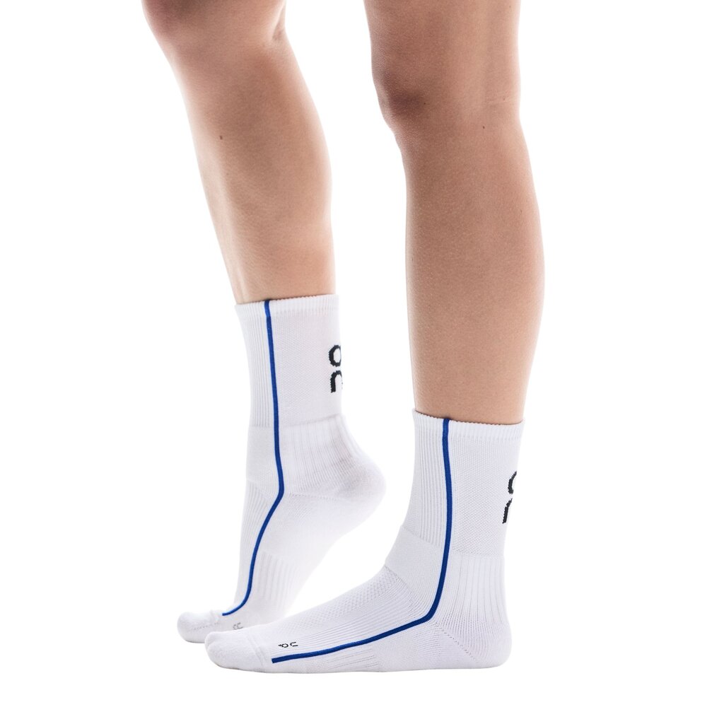 Tennis socks with ergonomic and zoned compression in the arch and ankle area for stability. Just what you need on the court. The On Court Sock High features targeted cushioning to absorb vibrations and terry padding in the Achilles tendon area for added protection. The open knit structure of the sock keeps your feet cool and dry. High ventilation zones allow moisture to easily escape. Made from recycled materials and organic cotton, the On Court Sock High features an eye-catching structured panel construction for less chafing and fewer blisters. Grab your racket and hit the ground running.