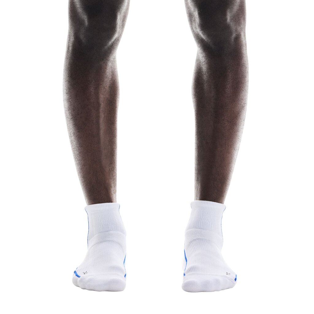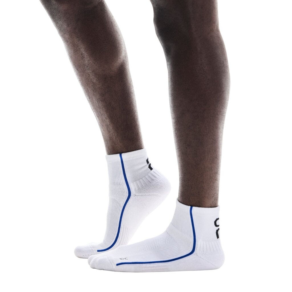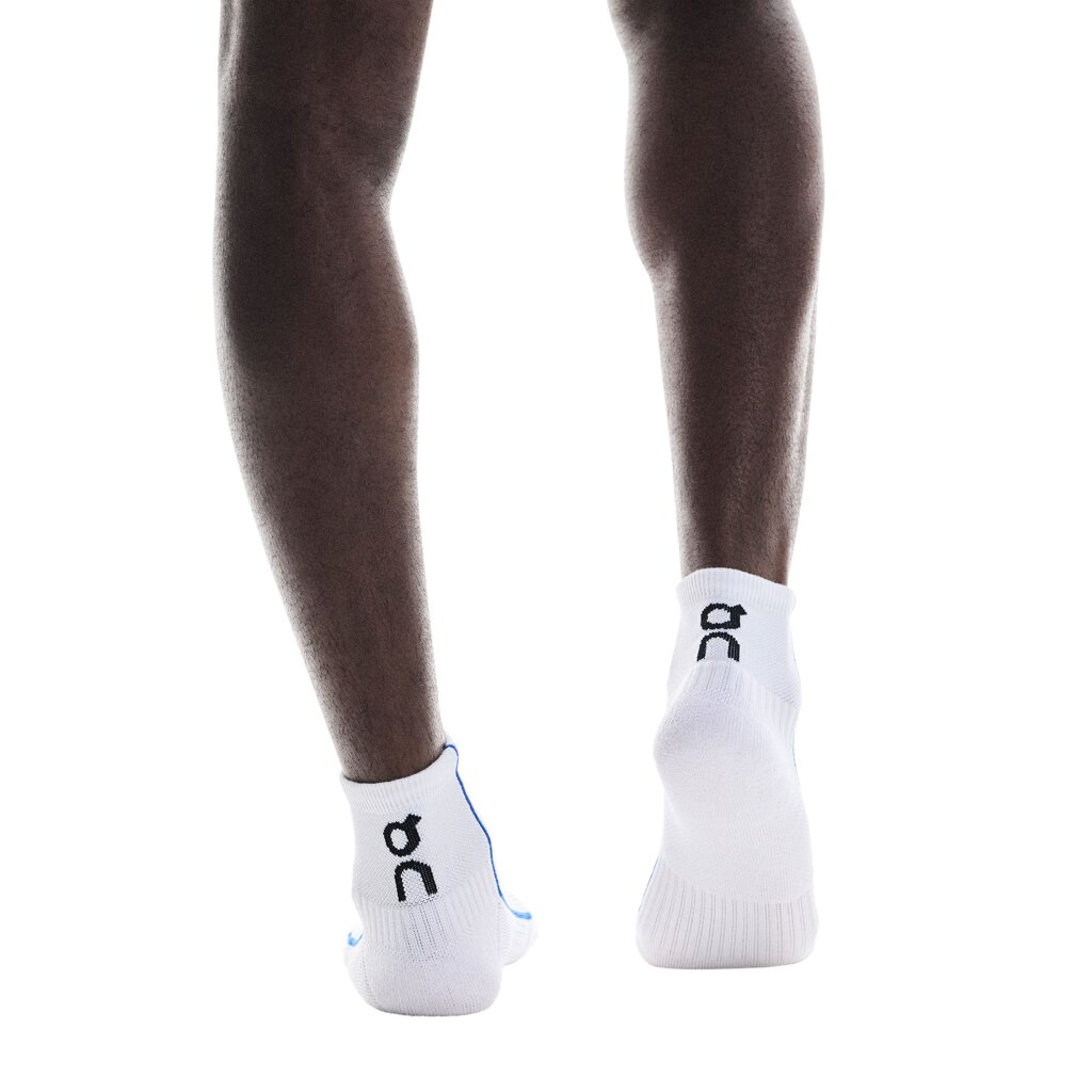 Tennis socks with ergonomic and zoned compression in the arch and ankle area for stability. Just what you need on the court. The On Court Sock Mid features targeted cushioning to absorb vibrations and terry padding in the Achilles tendon area for added protection. The open knit structure of the sock keeps your feet cool and dry. High ventilation zones allow moisture to easily escape. Made from recycled materials and organic cotton, the On Court Sock Mid features an eye-catching structured panel construction for less chafing and fewer blisters. Grab your racket and hit the ground running.