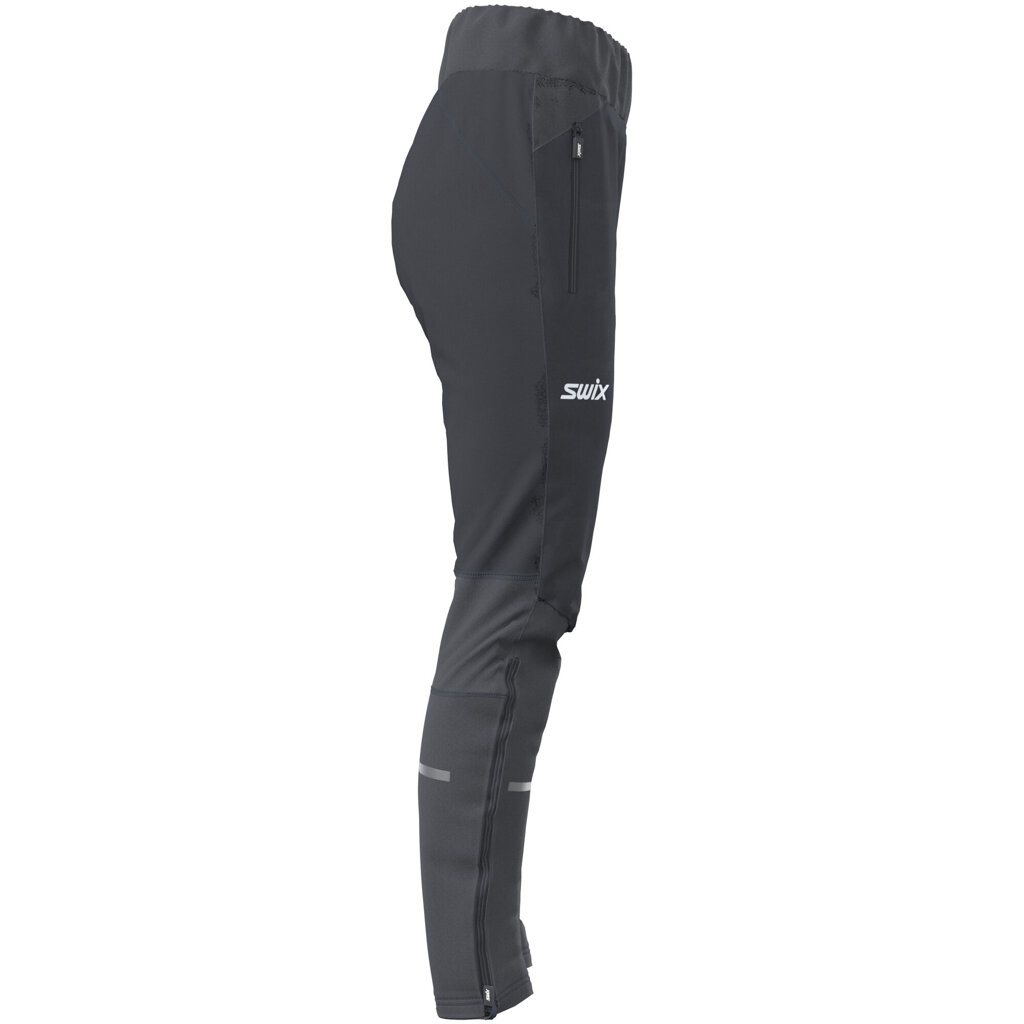 Dynamic Hybrid Insulated Pants are designed for cross-country skiing in colder weather and during high-intensity sessions. The body-mapped construction keeps you warm and dry, combining Primaloft® Silver Insulation Active 40g on the front thighs for extra warmth, a 3-layer windproof material on the front legs for protection, and a stretch brushed fabric on the back for improved mobility and moisture transport. These hybrid pants feature reflective details on the lower front and calves for increased visibility, an elastic waistband with Swix logo and drawcord for a secure fit, and a crotch gusset for enhanced freedom of movement. Two zippered hand pockets and long leg zippers make them practical and easy to put on or take off. Key Features: