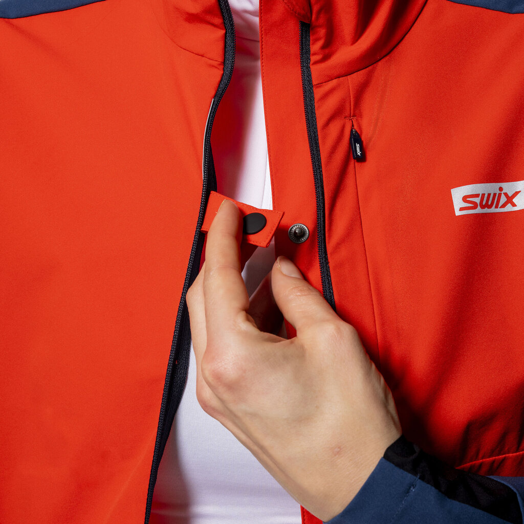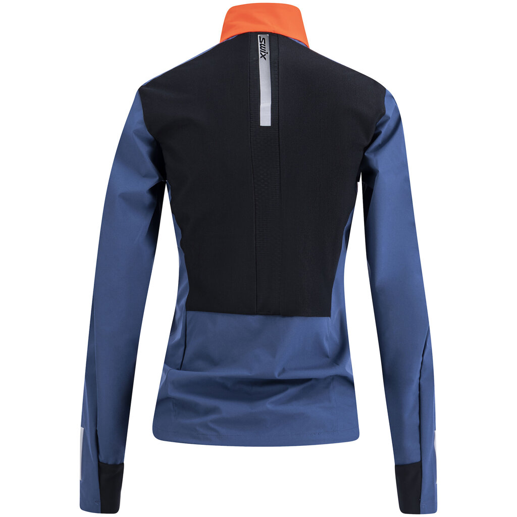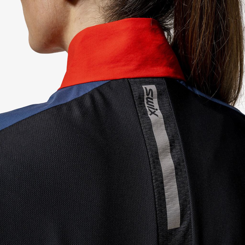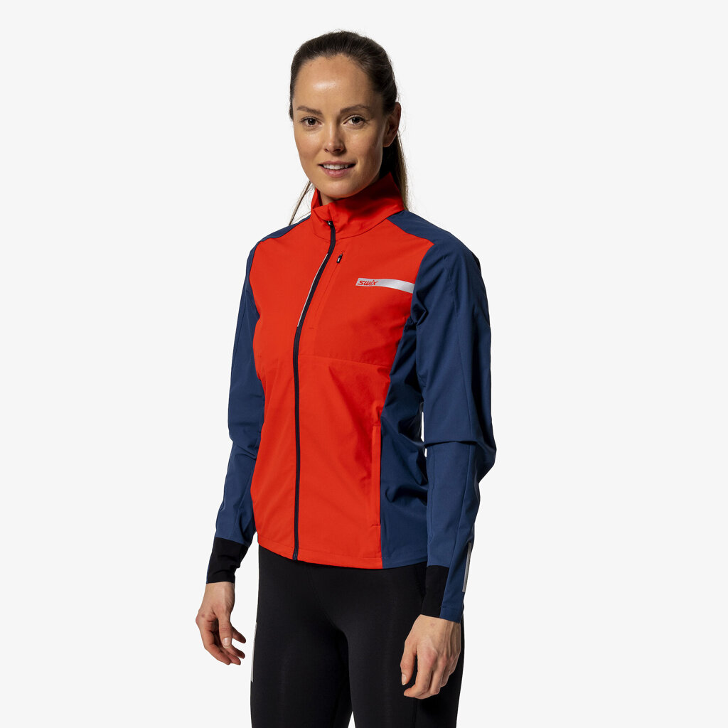 Swix Roadline Wind Jacket W is a technical training jacket for women, designed for roller skiing and running. It features wind-resistant front panels combined with stretchy and breathable materials to ensure comfort and mobility during high-intensity workouts. Bright colors and reflective details improve safety, while a zippered chest pocket holds your small essentials.