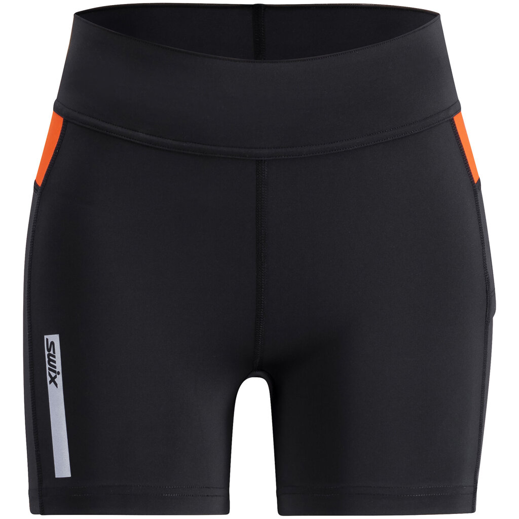 Swix Roadline Short Tights are tight-fitting performance shorts designed for women who train in roller skiing or running. Made from durable, stretchy fabric, these tights provide full freedom of movement and lasting comfort during high-intensity workouts. A high elastic waistband with an internal flat drawcord ensures a secure, adjustable fit, while an inseam gusset allows unrestricted mobility. Reflective details enhance visibility and safety in low-light conditions, and a discreet slip pocket offers convenient storage for small essentials. Key features: