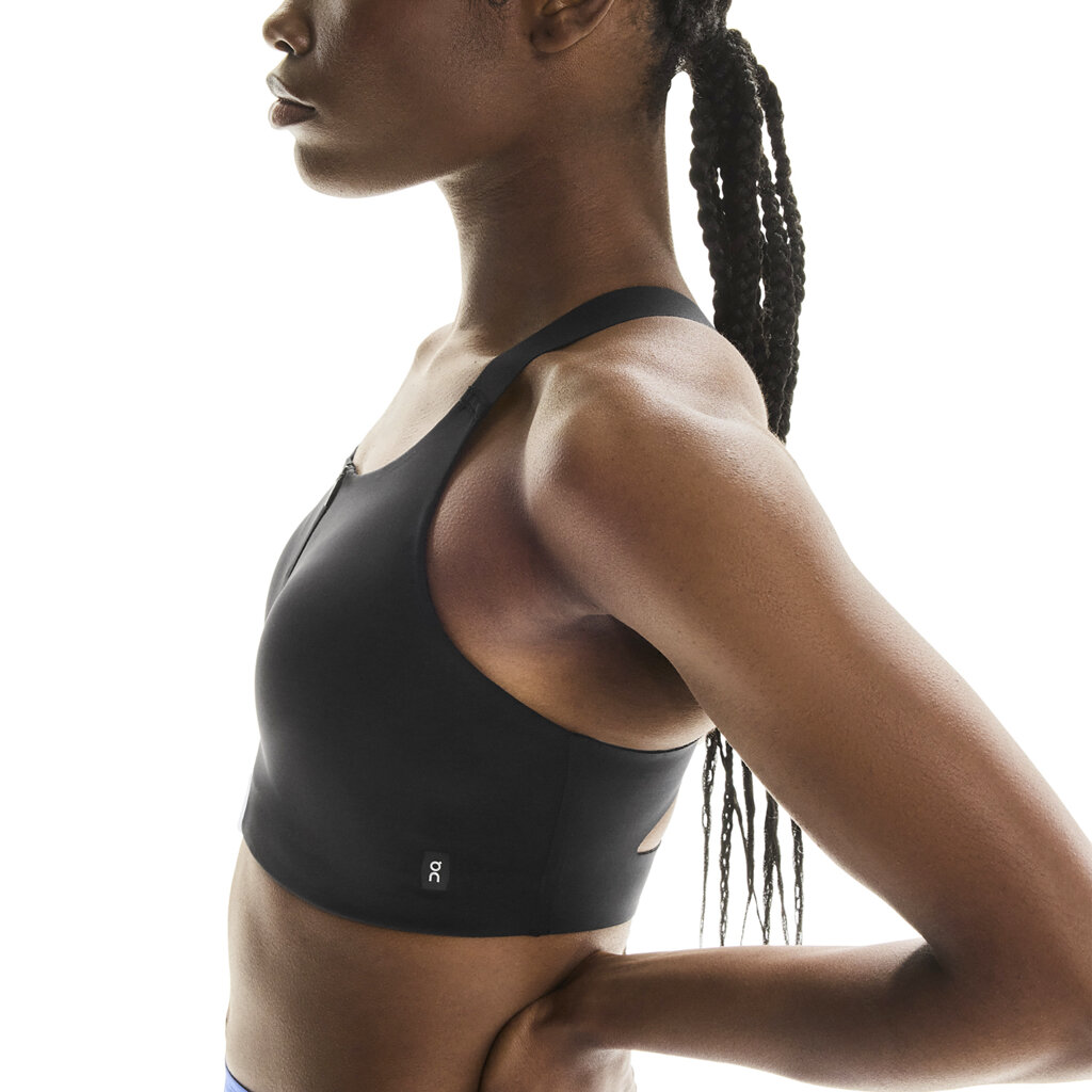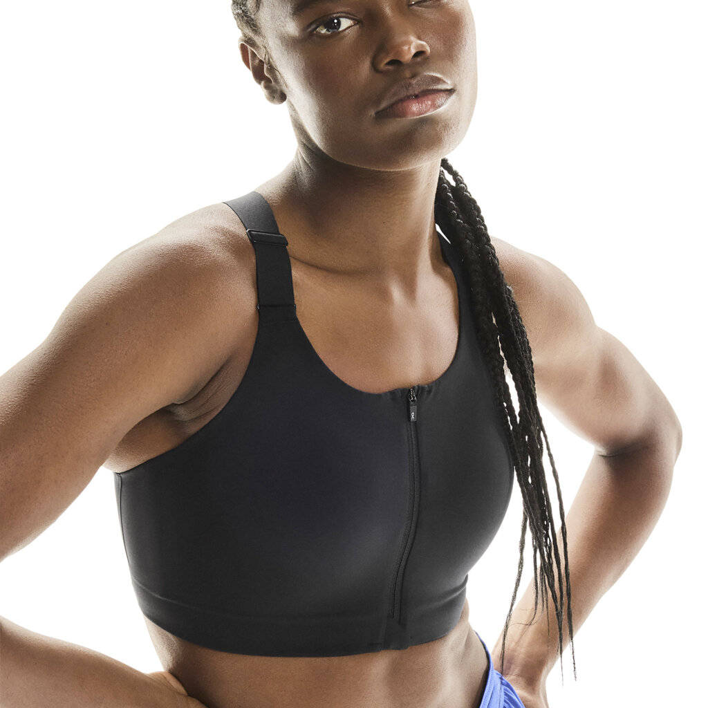 High-intensity sports demand no-budge solutions, and this bra is up for the challenge. With encapsulated cups that support each breast, it keeps everything in place more efficiently. Less bouncing, more top-level performance. No-fuss, adjustable straps make it easy to secure the perfect fit. Bonded seams create a clean look. And an open racerback construction balances breathability and support through long runs and other high-impact activities. Forget the struggle of removing your sports bra with this high-support solution. The zipper closure at the front makes it easy to put on and take off. The zip guard keeps distractions at bay, no matter how fast you run.