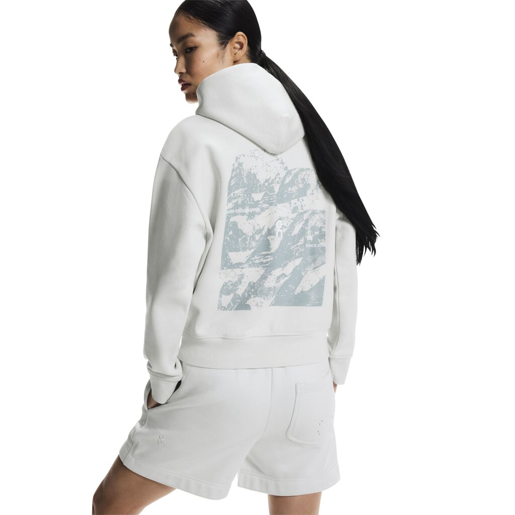 This hoodie features a classic, simple silhouette with a loose, relaxed fit. It's ideal for moments between workouts, casual wear, and travel. But be warned, it's so comfortable you'll never want to take it off. Its back is adorned with a graphic print inspired by the rugged texture of mountains, symbolizing strength, adventure, and perseverance in nature. It's crafted from a heavy-weight fabric – featuring preferred cotton on the exterior with a soft, brushed interior. Additionally, a kangaroo pocket keeps your hands warm and essentials close.